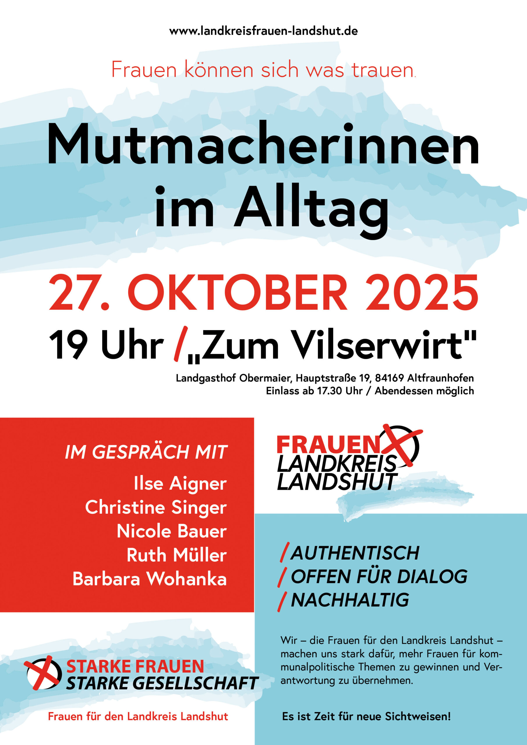 Wir – die Frauen für den Landkreis Landshut – machen uns stark dafür mehr Frauen für kommunalpolitische Themen zu gewinnen und Verantwortung zu übernehmen. Für den Landkreis Landshut möchten wir unsere Sichtweisen zu den Themenschwerpunkten lokale Gesundheitsversorgung, Nachhaltigkeit in Mobilität und regionaler Direktversorgung sowie Bildung ziel- und lösungsorientiert einbringen.